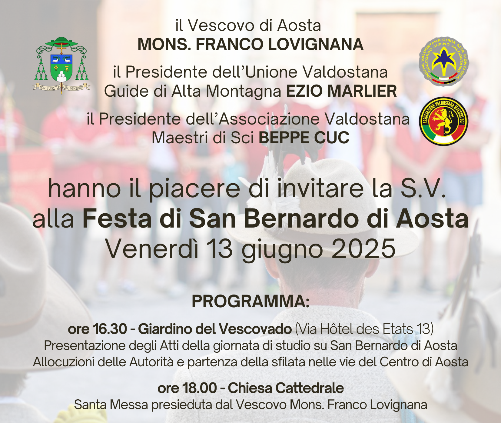 11 Giugno 202518 Giugno 2025EVENTI NELLA DIOCESIFesta di San BernardoPer il quinto anno consecutivo le Guide alpine e i Maestri di sci si riuniscono in onore di San Bernardo loro patrono condividi su