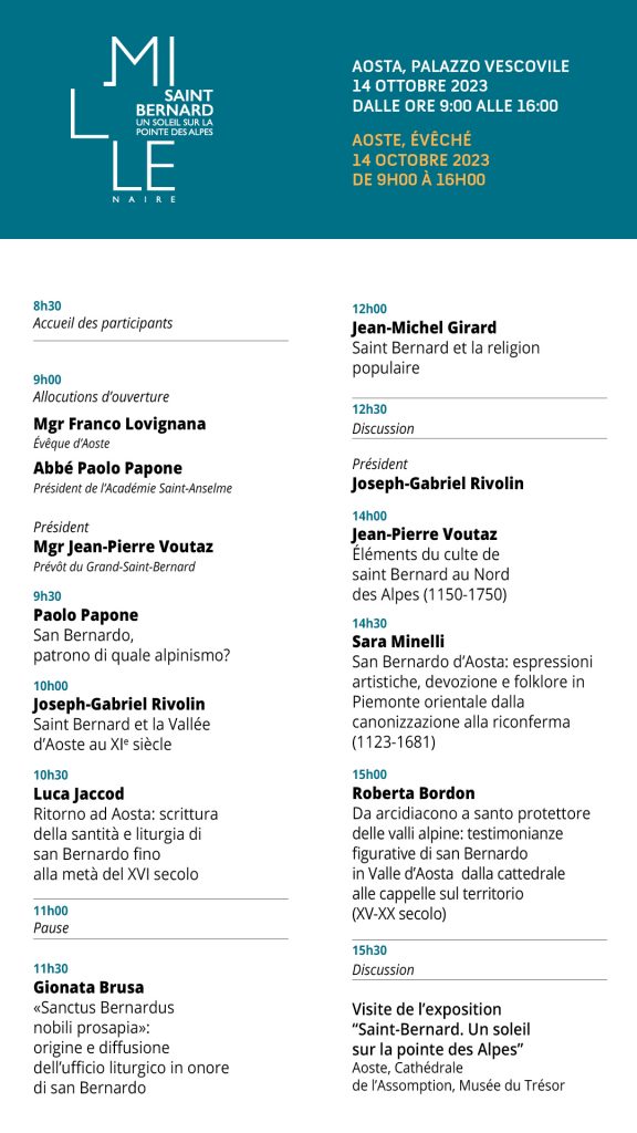 La giornata di studio è organizzata dalla Diocesi di Aosta in collaborazione con l’Académie Saint-Anselme, nell’ambito delle celebrazioni per il centenario della proclamazione di san Bernardo patrono degli abitanti delle Alpi e degli alpinisti.