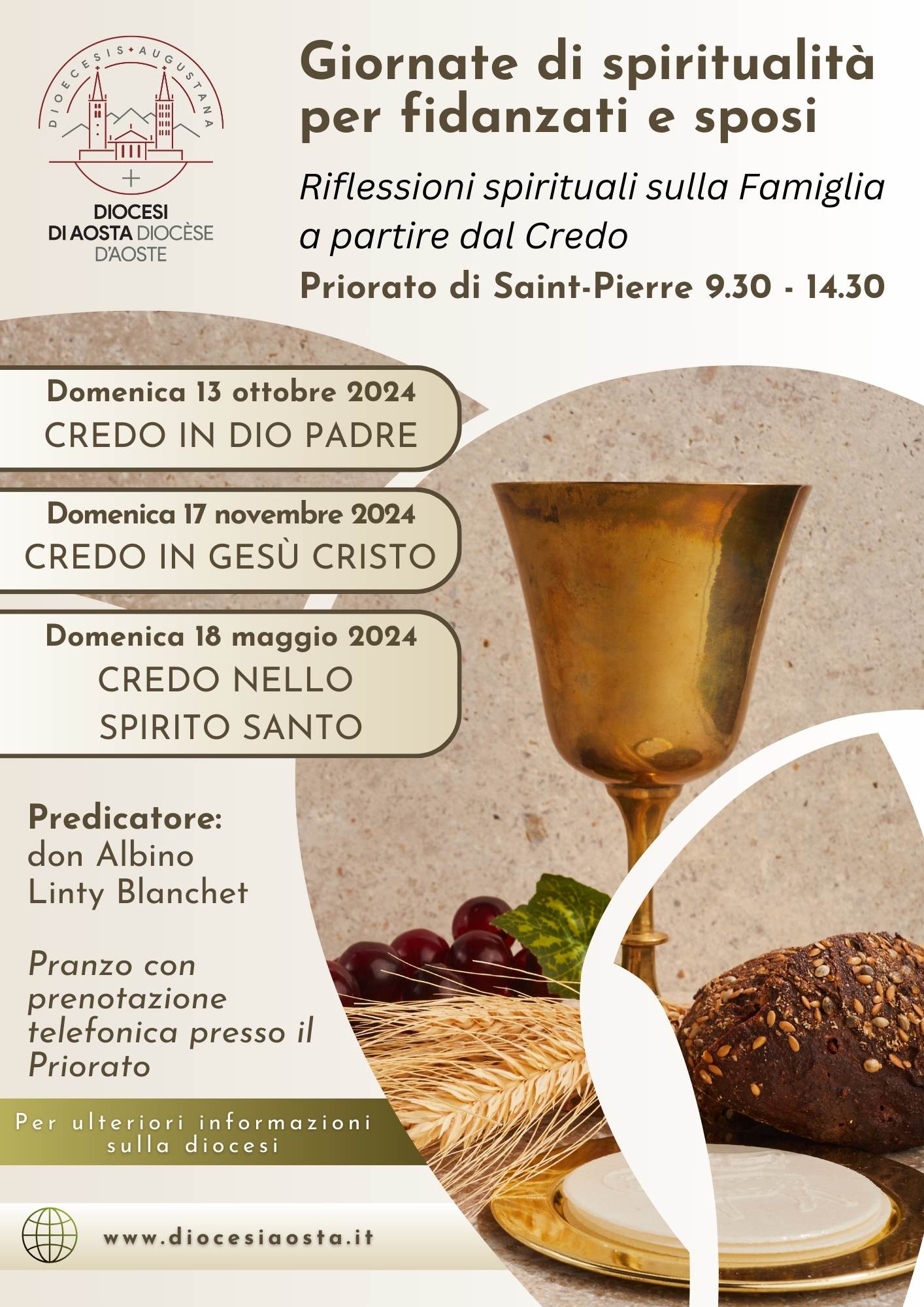 Tutti gli incontri si svolgeranno presso il Priorato di Saint-Pierre dalle ore 9.30 alle ore 14.30 con possibilità di pranzare presso la casa, previa prenotazione telefonica allo 0165.903823.