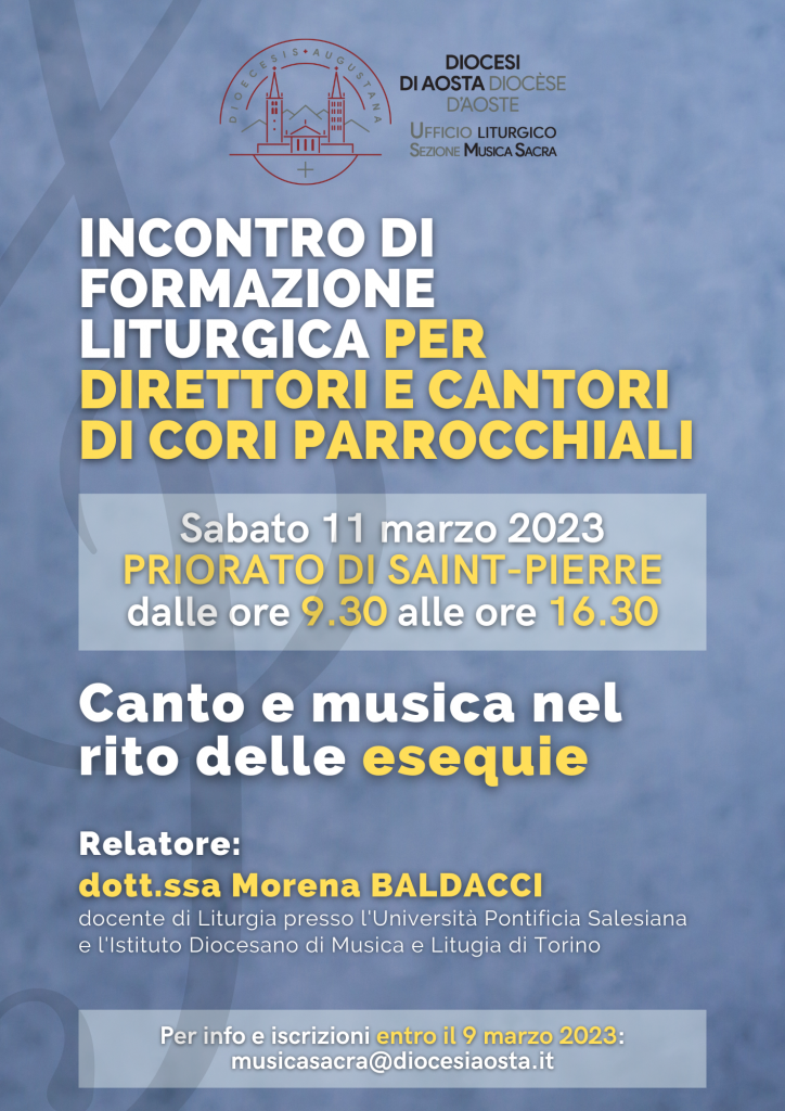 L’ufficio Liturgico – sottosezione Musica sacra organizza un incontro annuale di formazione liturgica rivolto ai direttori e ai cantori di cori parrocchiali dal titolo Canto e musica nel rito delle esequie.