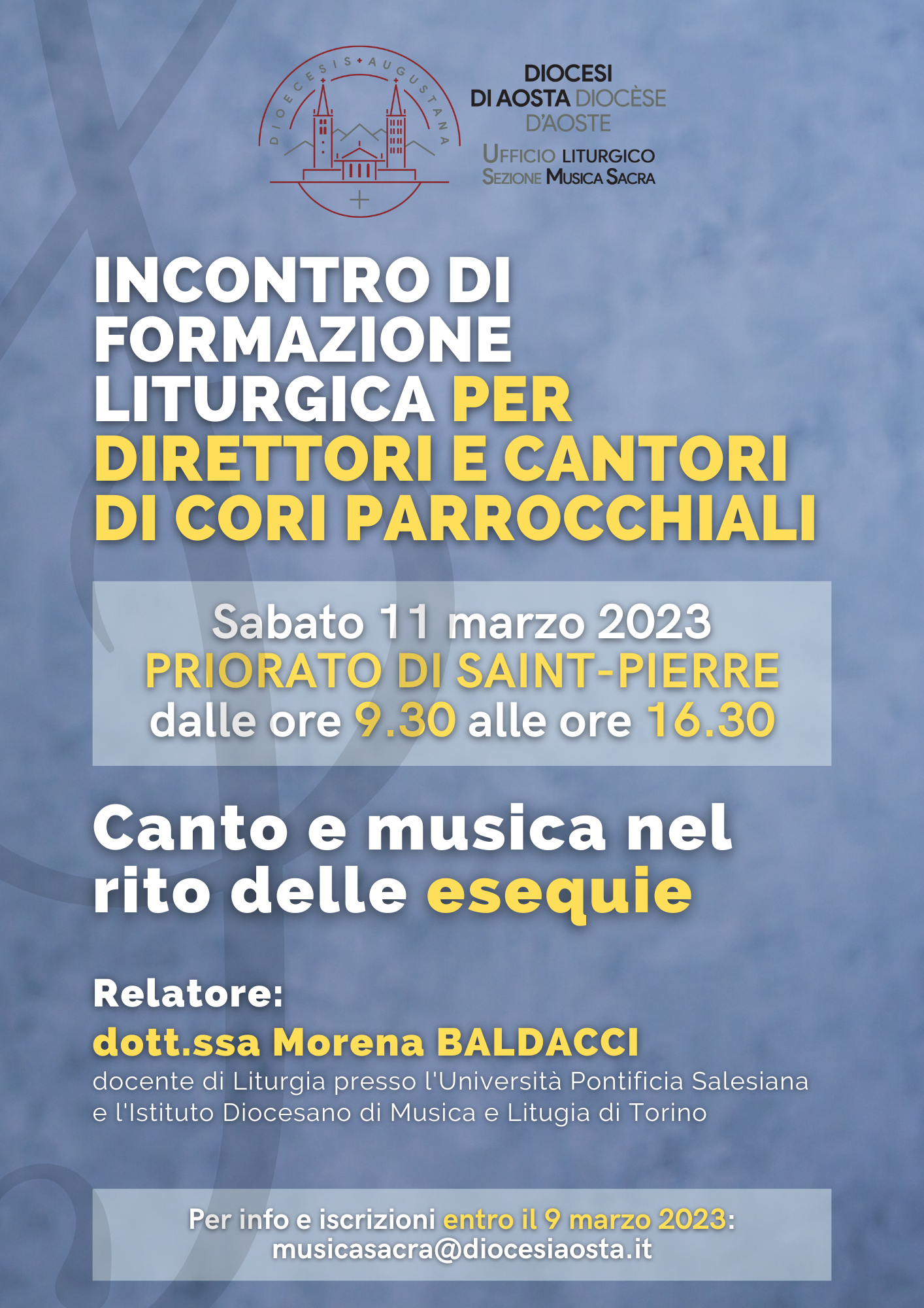 L’incontro sarà guidato dalla dott.ssa Morena Baldacci, docente di Liturgia presso l’Università Pontificia Salesiana e l’Istituto Diocesano di Musica e Litrugia di Torino.