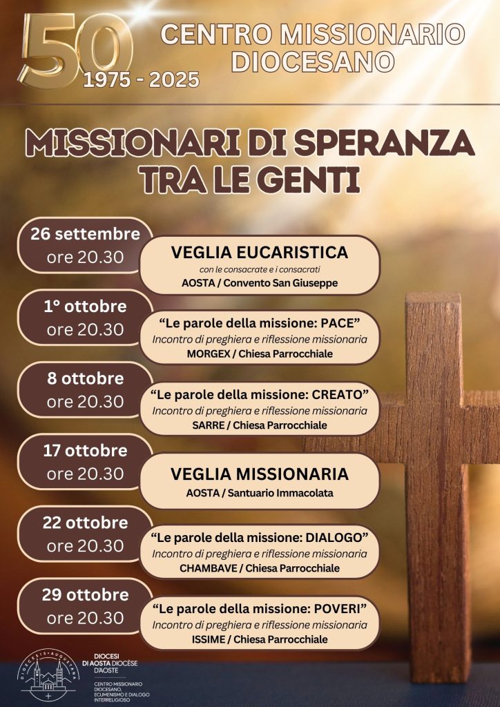 Il tema della Giornata Missionaria Mondiale scelto da Papa Francesco per quest’anno è “Missionari di speranza tra le genti”. Esso vuole ricordarci – come d’altronde ogni messaggio – che siamo inviati non da soli, ma come Chiesa, radicati in una storia feconda e continuamente aperti alle sfide del presente e del futuro. Le celebrazioni e gli incontri di preghiera indicati nella locandina allegata sono occasioni preziose per rendere grazie, per crescere nella comunione e per riscoprire la bellezza di essere Chiesa in uscita.