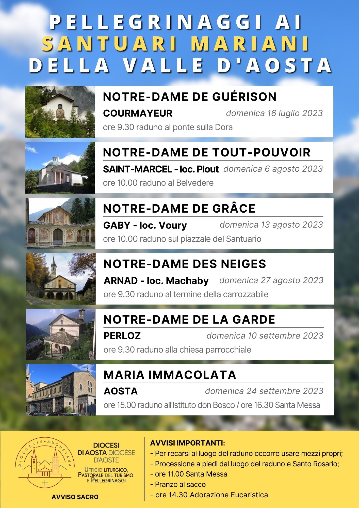 14 Giugno 202318 Giugno 2025Liturgico, pastorale del turismo e pellegrinaggiPellegrinaggi ai santuari mariani della Valle d’Aosta 2023da luglio a settembre, tutte le date, i luoghi e gli orari condividi su