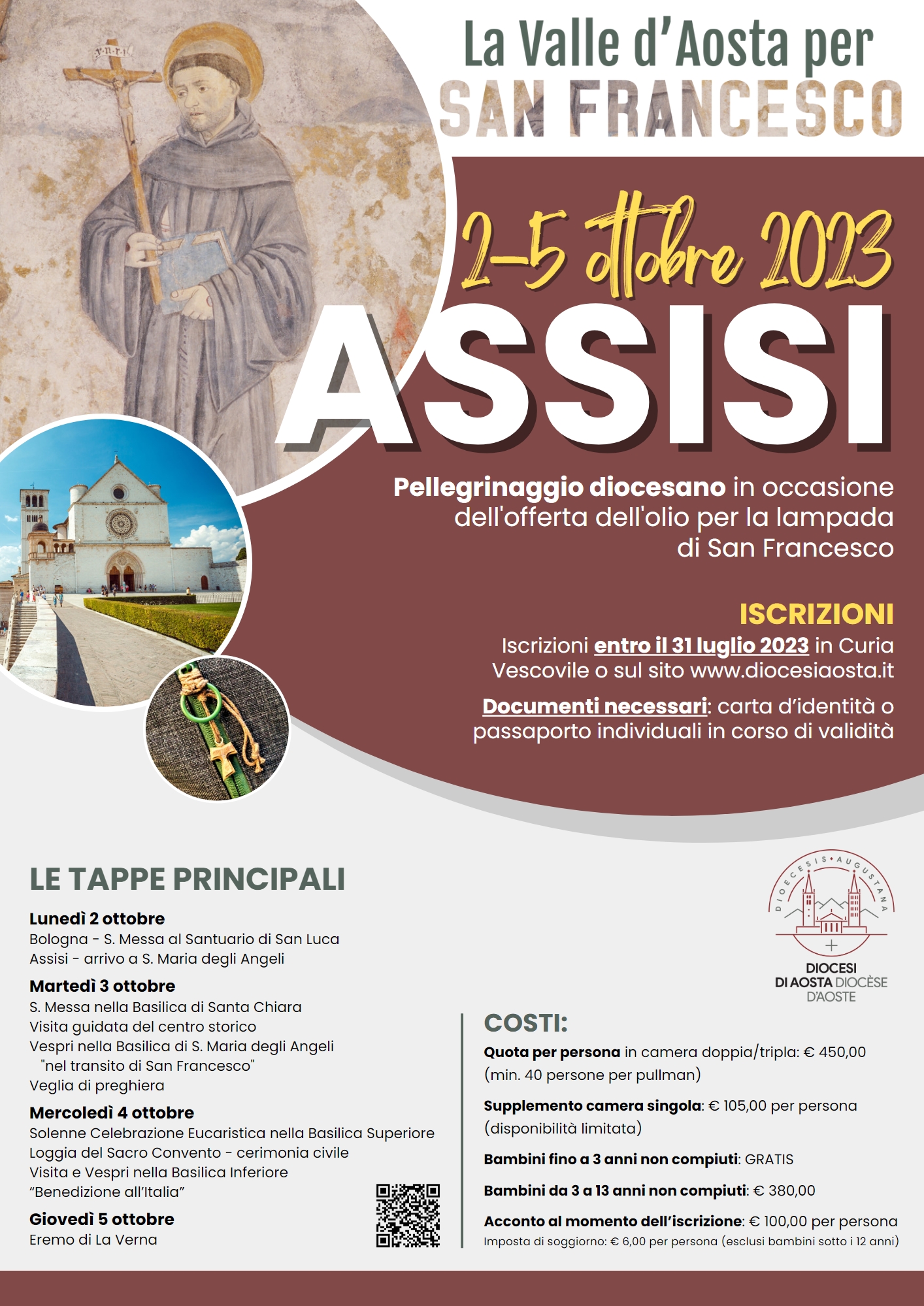 Trasferimento alla Basilica Superiore per la solenne Celebrazione Eucaristica nella festa di San Francesco, Patrono d’Italia, presieduta da Mons. Vescovo alle ore 10.00. Loggia del Sacro Convento, ore 11.30, saluto del Ministro Generale dell’Ordine dei Frati Minori Conventuali e messaggi del Presidente della Regione Autonoma Valle d’Aosta e del Rappresentante del Governo italiano. Rientro in hotel per il pranzo. Nel pomeriggio trasferimento alla Basilica Inferiore e tempo a disposizione. Ore 16.00 celebrazione dei Vespri presieduti da Mons. Vescovo; al termine processione ai piedi della Loggia da dove sarà impartita la “Benedizione all’Italia”. Rientro in hotel per cena e pernottamento.