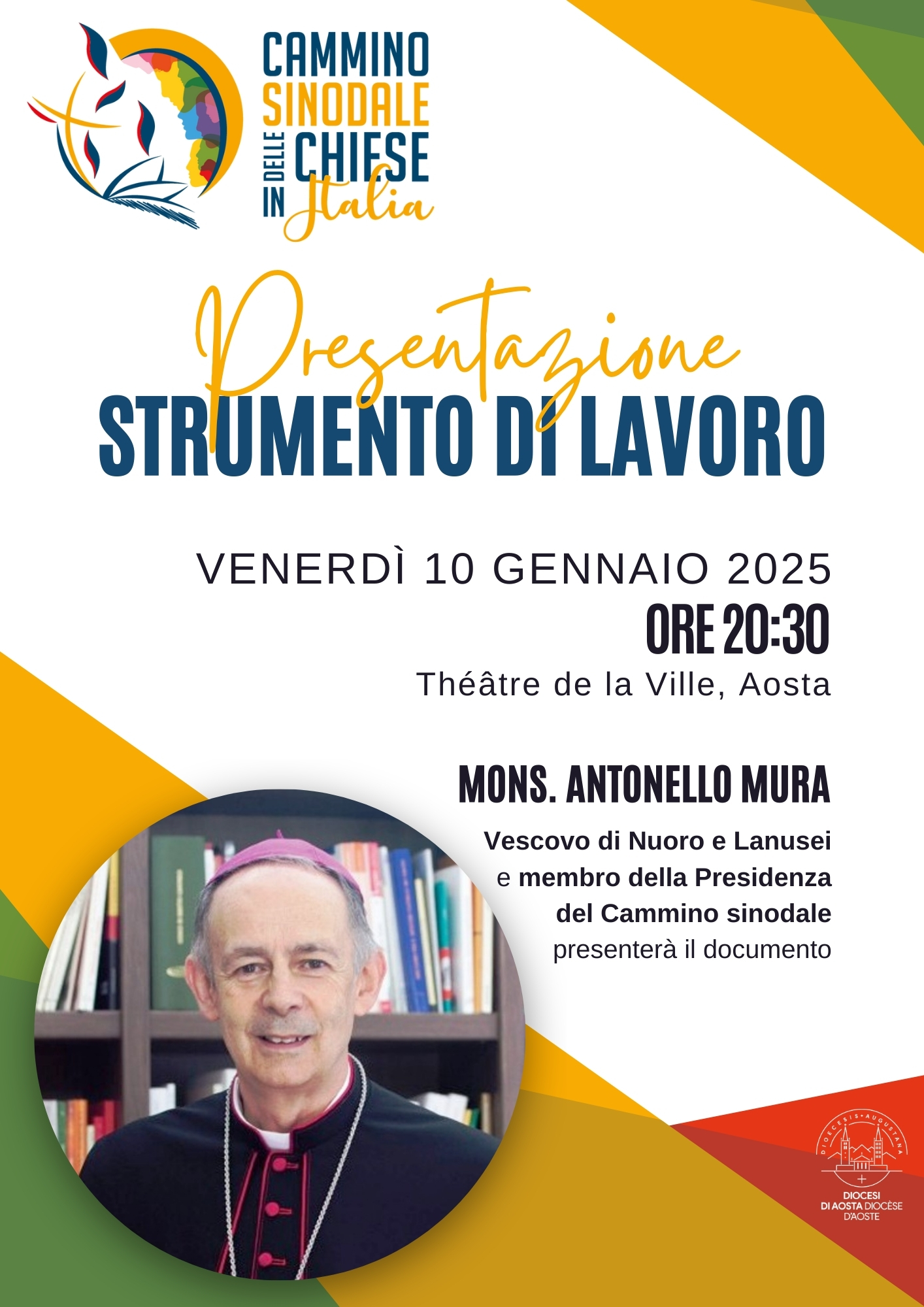 Tutti i membri dei Consiglio pastorali di Unità parrocchiale e tutte le persone che lo desiderano sono invitati a partecipare alla conferenza che si terrà venerdì 10 gennaio 2025 alle ore 20.30 presso il Théâtre de la Ville ad Aosta, tenuta da Mons. Antonello Mura, Vescovo di Nuoro e Lanusei e membro della Presidenza del Cammino sinodale.
