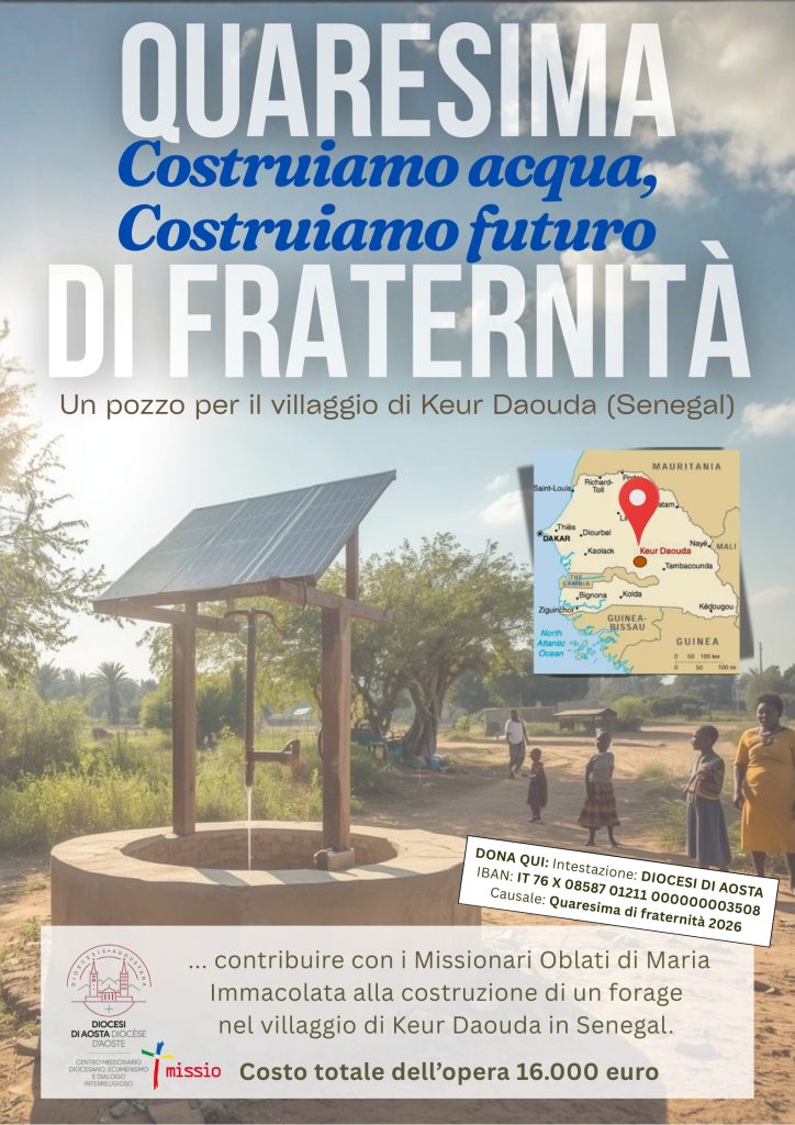 Allego la locandina con la presentazione del progetto sostenuto quest’anno: “Costruiamo acqua, costruiamo futuro”, promosso dai Missionari Oblati di Maria Immacolata e seguito in particolare da fr. Stefano Tasca OMI, a favore della comunità di Keur Daouda, in Senegal. Un progetto semplice e decisivo, che attraverso l’accesso all’acqua potabile restituisce dignità, salute e possibilità di sviluppo.